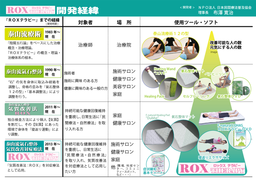 気石整体とは、身体の調整に鍼や灸ではなく、石の気の用具を使用し、経穴や経絡に刺激を与え、家庭でも手軽に身体の調整ができるように考案されたのが「気石整体」です。そして「気石整体」がより改善され対症療法から本治治療までを可能にしようと試み、考案されたのがRoxtherapyであり気質改善法Roxtherapyです。
