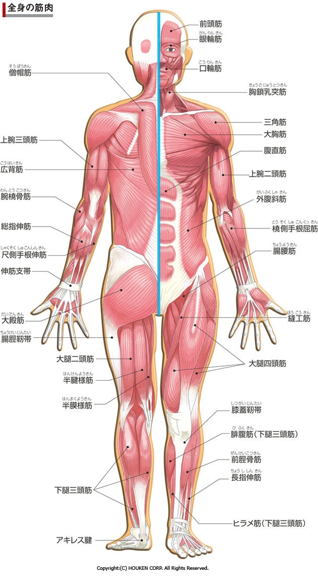 人体をの骨格を支えたり、人体が運動できるのは筋肉がしっかりその役目をはたしているからである。その数は全身で約600個あり、筋肉の種類は横紋筋と平滑筋に構造上大別される。内臓筋は心筋を除いて主に平滑筋構造で、骨格運動筋は横紋筋構造である。又その作用の種類は主動筋、拮抗筋、協力筋があり、作用は動作により相互関係で呼称が変わる。